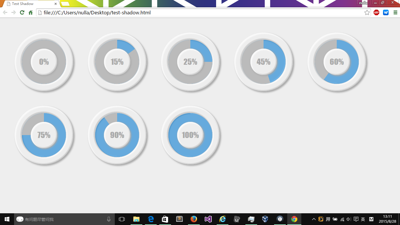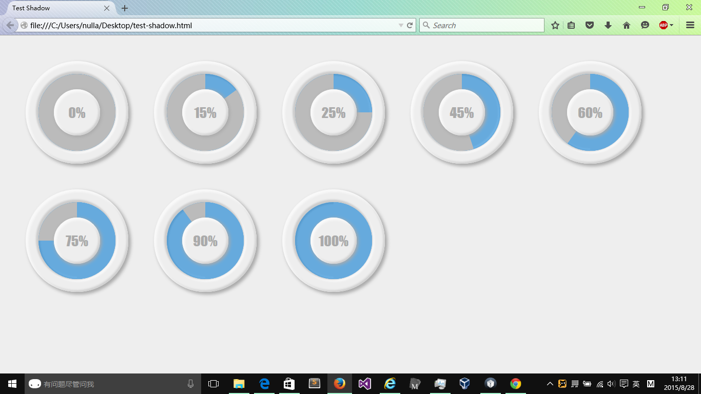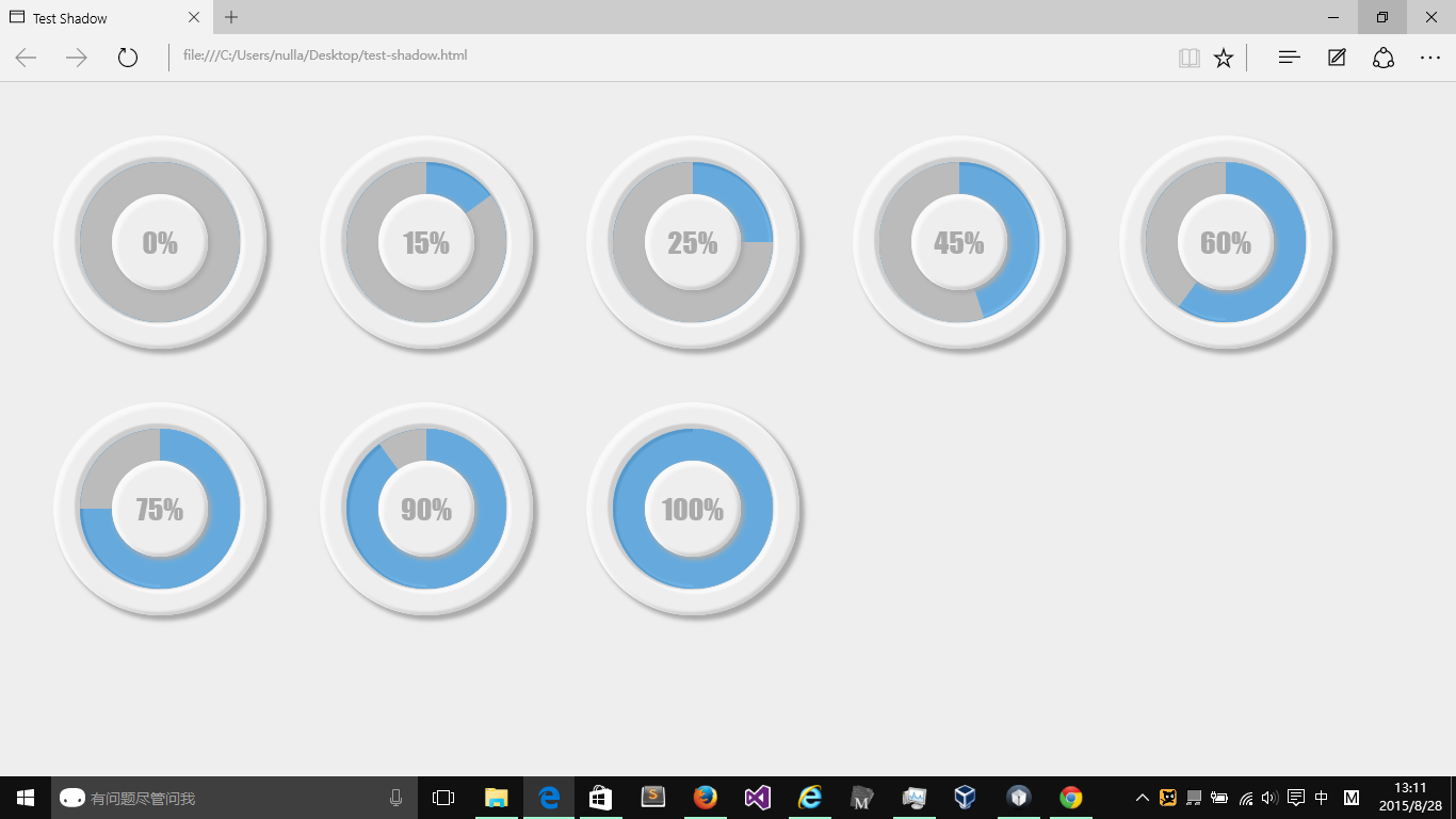 两个 div 旋转控制显示,用 jQuery 遍历所有圆形图,读取百分比,控制旋转角度。另外加了好多层阴影。只能兼容到 IE9。 主要代码