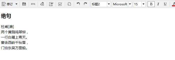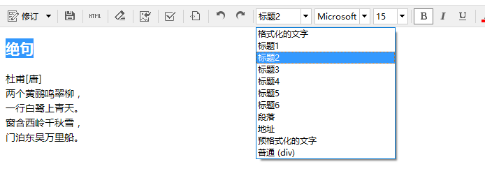 你是怎么实现的?选中字体,改字号,然后加粗?这样当然也可以,但是如果你有好多诗,挨个改标题的字号,字体是不是麻烦了些。你有没有注意到有个“段落”或者“普通(div)”下拉菜单在字体旁边?选中之前的标题文字,点击这个下拉菜单,选择,标题2: