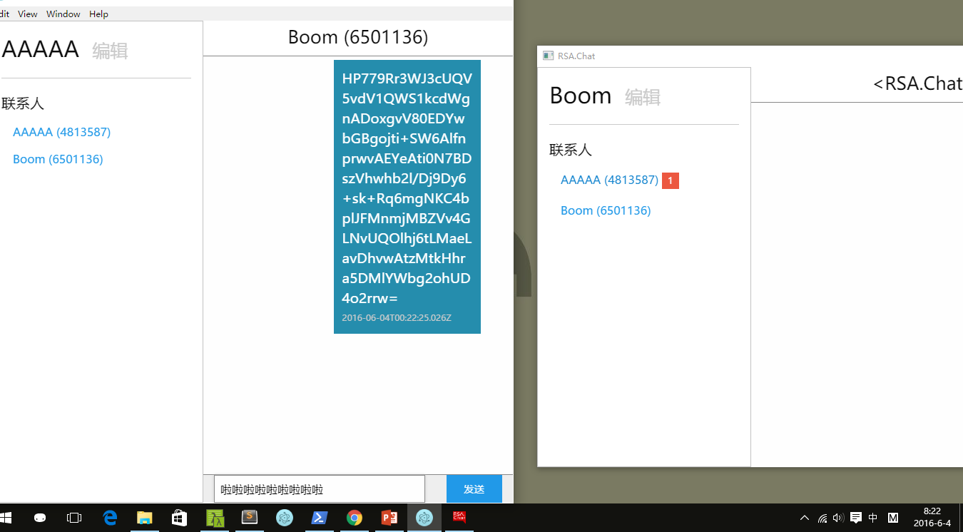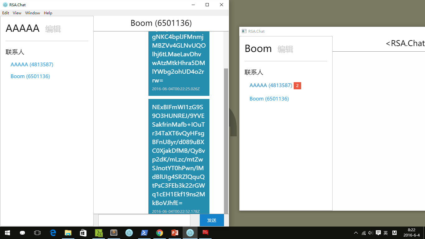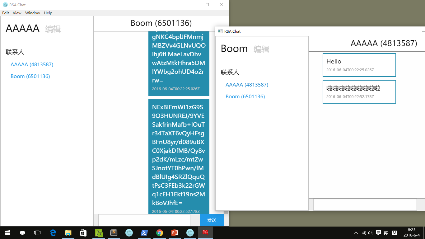 信息论大作业,用 Electron 写了个 RSA.Chat,用 1024 位 RSA 密钥对发出的消息用收信人的公钥加密,则除了收信人之外其他人不可解读,客户端和服务端通信用 socket.io,数据格式为 json。密钥生成和加解密都用 node-rsa。客户端 用了 vue.js 更新数据,jQuery 操作 DOM。