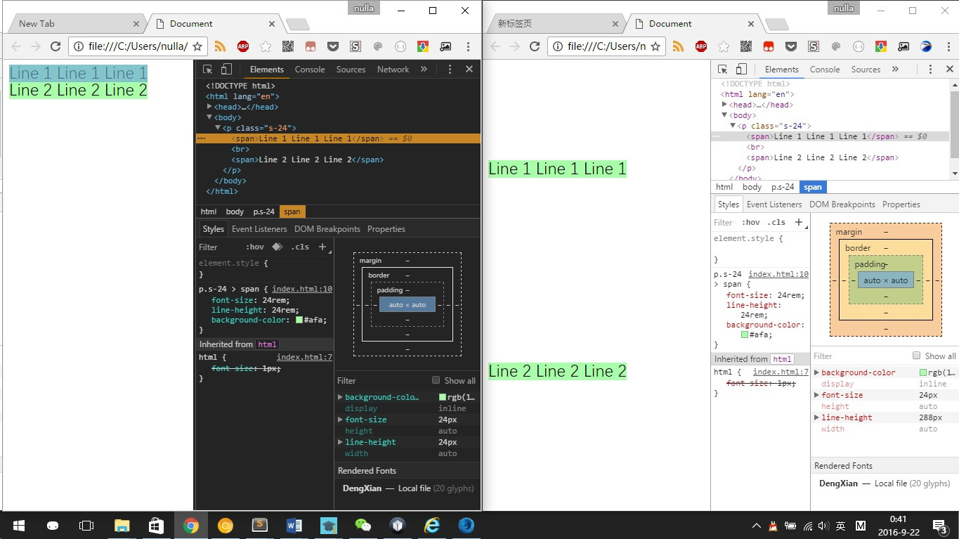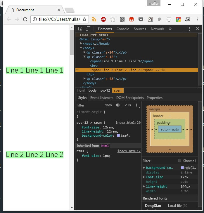 Chrome 浏览器,将 html 的 font-size 设为 1px 时; 基于 rem 设定的元素字体大小正常,行高是正常的12倍。 这个问题只出现在 Chrome 上, 然后如果 html { font-size: 100px; } 然后去设 .24rem 的话一切正常。 目测跟 Chrome 中文字体大小不能小于 12px 有关。